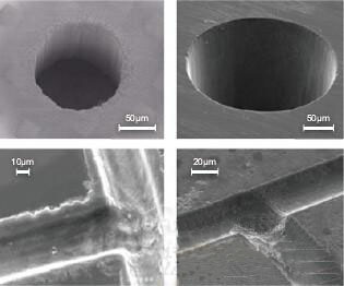 圖1:使用納秒激光器(左圖)和使用近紅外(NIR)飛秒激光器(右圖)對玻璃進行激光加工示例。