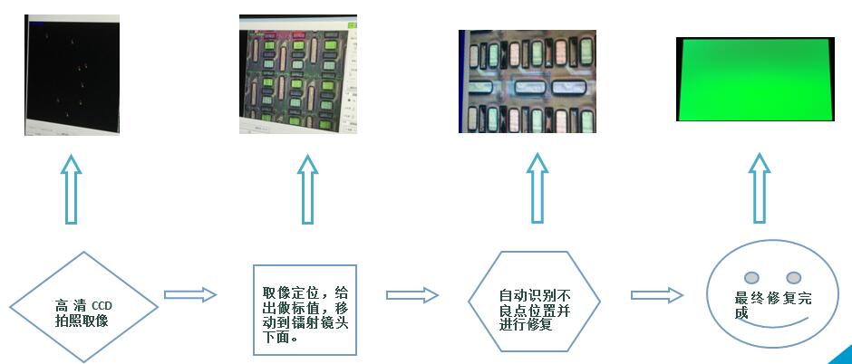 主要應用于TFT-LCD、IPS、LTPS、OLED等顯示面板行業,針對制程當中發光區域內產生的亮點、灰亮點、亮線不良進行鐳射修復。整個修復過程是通過高清像素CCD自動定位,拍照取像分析,給出不良點坐標,然后計算機根據指令將修復用的鐳射鏡頭移動到位,自動識別出不良點的形狀大小,激光會做出不同方式的維修。詳見如下圖解: